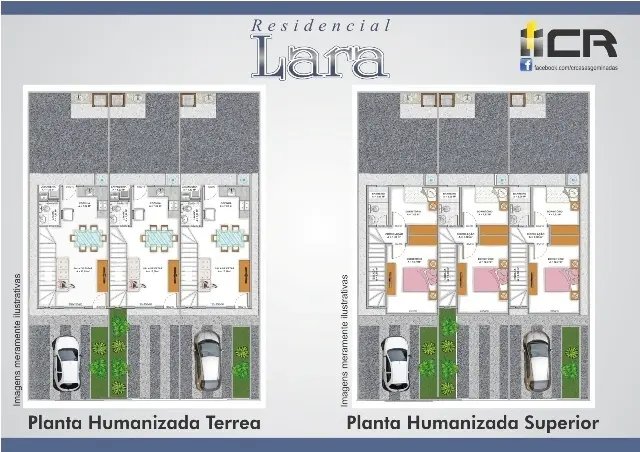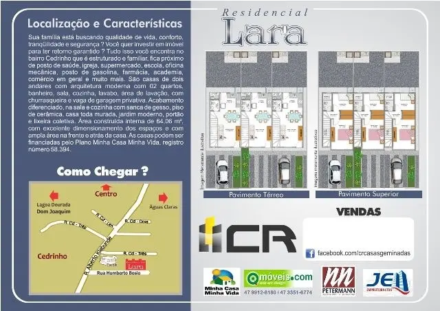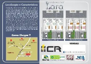 Casa de dois andares com arquitetura moderna com: 02 quartos Banheiro Sala Cozinha Lavabo Área de lavação com churrasqueira e vaga de garagem privativa. Acabamento diferenciado, na sala e cozinha com sanca de gesso, piso de cerâmica, casa toda murada, jardim moderno, portão e lixeira coletiva. Área construída interna de 64,06 m², com excelente dimensionamento dos espaços e com ampla área na frente e atrás da casa. As casas podem ser financiadas pelo Plano Minha Casa Minha Vida, registro número 58.394.